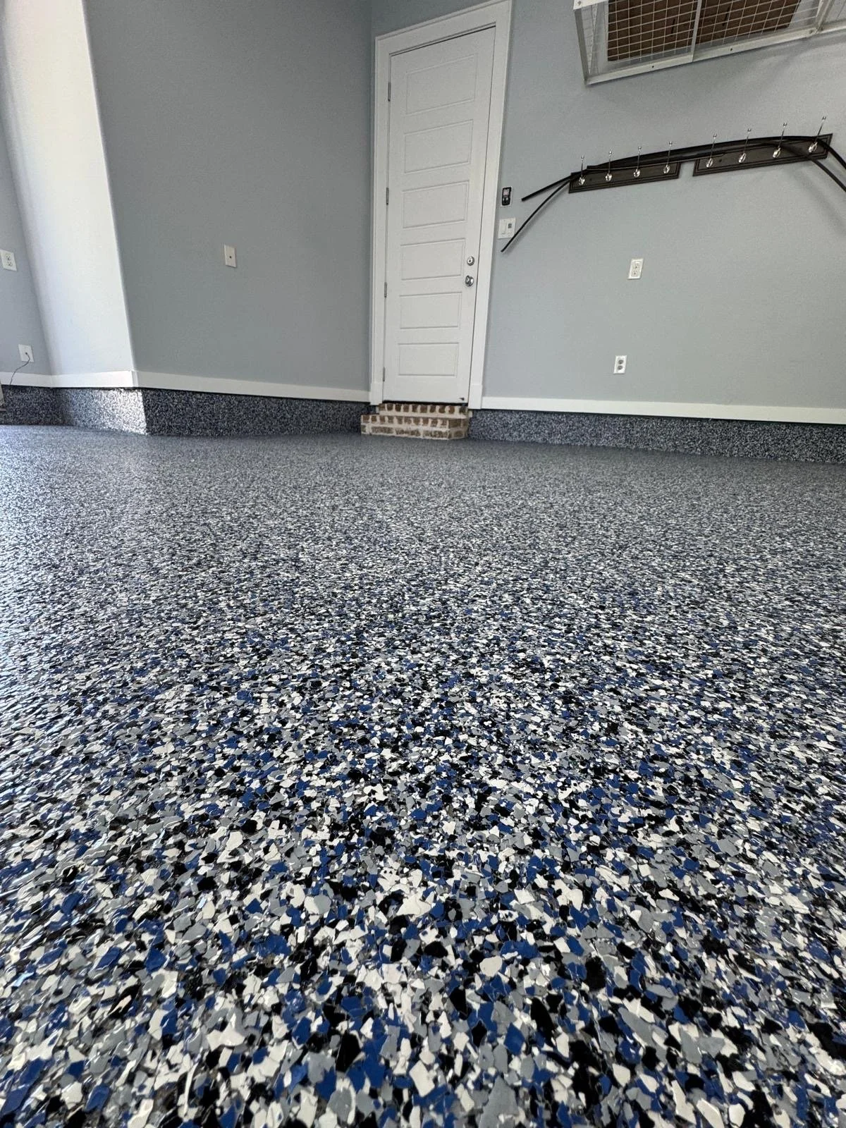 Flake epoxy has a strong base with colorful flakes and a clear topcoat, creating a durable, slip-resistant, and low-maintenance surface.